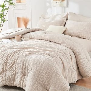 Beige Queen Comforter Set Seersucker 7 Pieces, All Season Luxury Bed in a Bag Set with Comforters, Sheets, Pillowcases & Shams