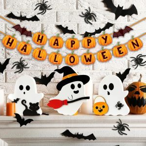 22Pcs Halloween Decorations Indoor, Halloween Spooky Decorations with 3 Charming Wooden Tiered Tray Decorations, 12Pcs 3D Bats Wall Decor, 1Pcs HAPPY HALLOWEEN Banner and 6Pcs Spider Decorations