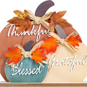 Fall Decorations for Home, Farmhouse Wooden Pumpkin Decor for Autumn Thanksgiving, Blessed Grateful Thankful Decorative Pumpkin Sign for Table, Office Desk, Fireplace Mantle