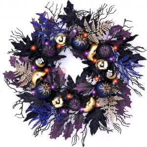 DecorbyHannah Collapsible Halloween Door Wreath, 24 Inch Light Up Black Halloween Wreaths for Front Door with Maple, Pumpkins and Witch Ornaments Decorations Indoor Outdoor for Porch Window