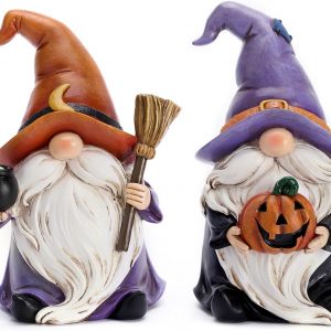 Valery Madelyn Halloween Decorations Indoor, 2 Pcs Resin Halloween Gnomes Decor for Home with Broom Witch Hat Jack O Lantern Moon, Collectible Figurines Elf Dwarf for Table Tiered Tray Outdoor, 3.6”
