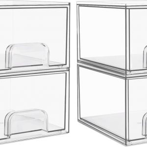 4 Clear Stackable Storage Drawers, 4.4” Acrylic Makeup Organizer,Storage Bins For Vanity, Undersink, Kitchen Cabinets, Pantry, Home Organization
