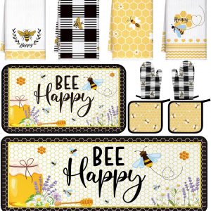 10 Pcs Bee Kitchen Dish Towel, Rug, Oven Mitts, and Pot Holder Set Farmhouse Kitchen Decor for Mom Daughter Gift Cooking Baking Grilling (Cute Yellow Black)