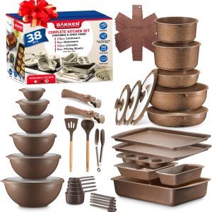 Bakeware Set – Nonstick Granite Coating, Pots and Pans with Detachable Handles and Tempered Glass Lids