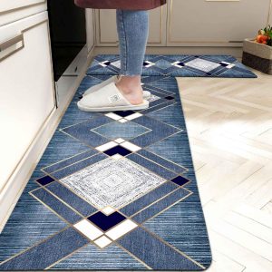 Blue Kitchen Rugs Mats Set of 2 Navy Grey Geometric Gold Line Anti Fatigue Kitchen Mat for Floor Non-Slip Rubber Cushioned Standing Mat Modern Kitchen Rug for Sink Laundry Home ,17.3×28+17.3×47 inch
