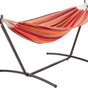 2 Person Heavy Duty Double Hammock with 9-Foot Space Saving Steel Stand and Carrying Case, 450 lb Capacity, Sunset Orange, Stripe, 110 x 47 x 43 Inches