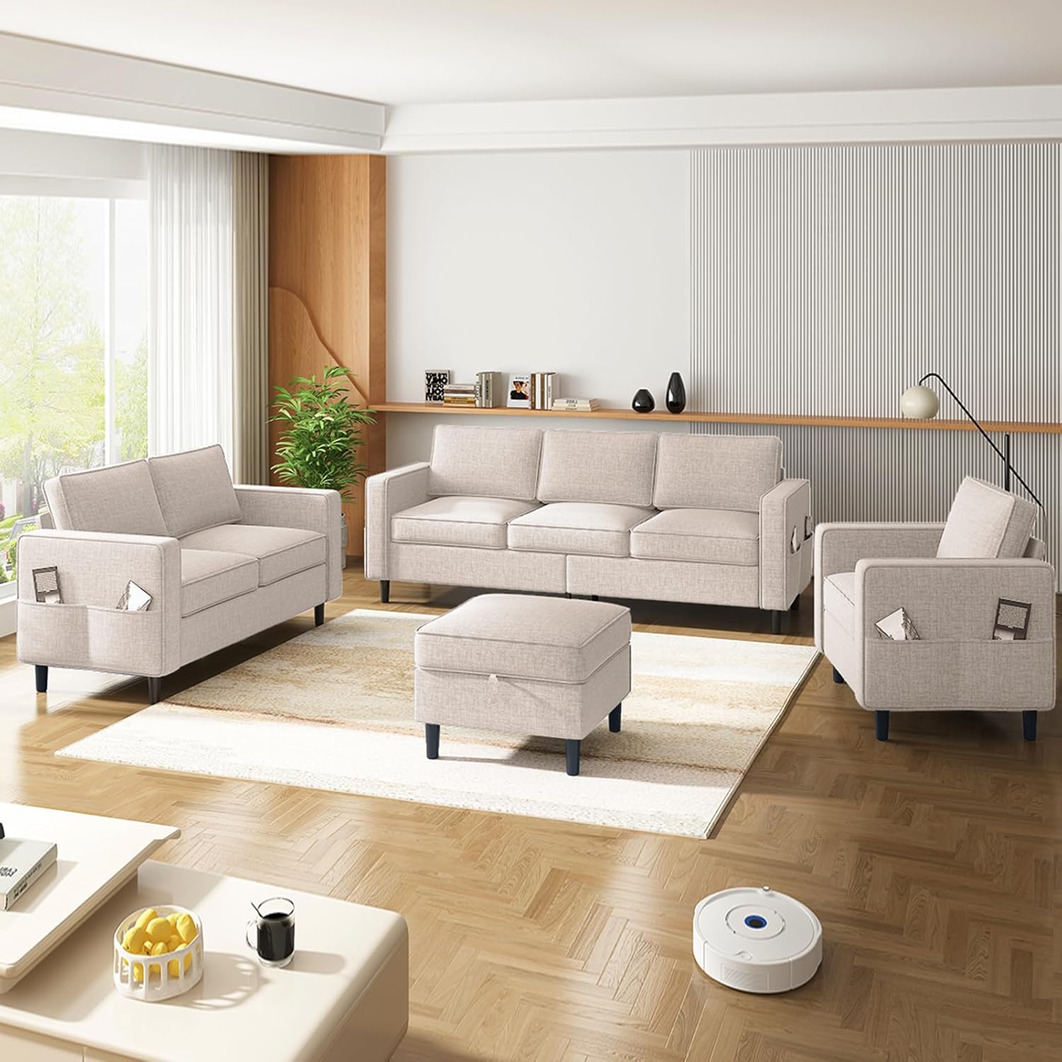 3 Piece Living Room Sofa Sets, Modern 3 Seater Sofa with Ottoman and Loveseat and Armchair Sets, Linen Fabric L Shaped Couch + 2-Seat Sofa + Accent Chair Furniture Sets
