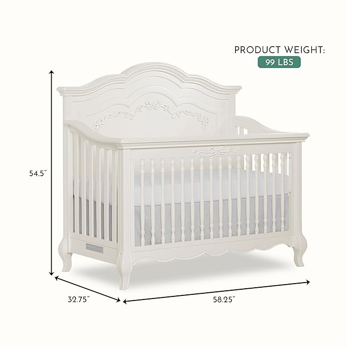 - TIMELESS STYLE – Available in five elegant finishes to match any nursery theme. Pairs beautifully with the Evolur Aurora Double Dresser for a coordinated look (sold separately). Crib dimensions – 58.25″ L x 32.75″ W x 54.5″ H with a weight of 99 lbs.