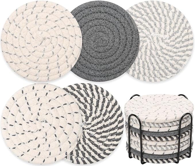 - Package including: Coffee Table Coasters 10 pieces of round hand-woven cotton coasters in 5 styles and a metal holder. The simple design and classic colors of these coasters go well with any table decor and perfect integrate into any home decor style, like kitchen, bedroom, or every corner in your home.