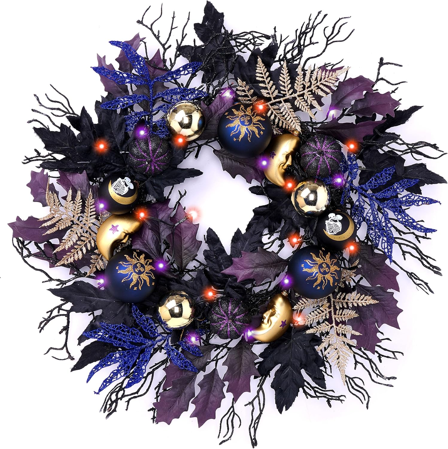 • 【Rich Accessories】Our Halloween wreath boasts a base of twisted branches, complemented by dark purple and black maple leaves and sparkling twigs for an enchanting touch. It’s adorned with playful moons, pumpkins, and distinctive balls showcasing sun and skull designs, adding a touch of magic charm to your holiday decor