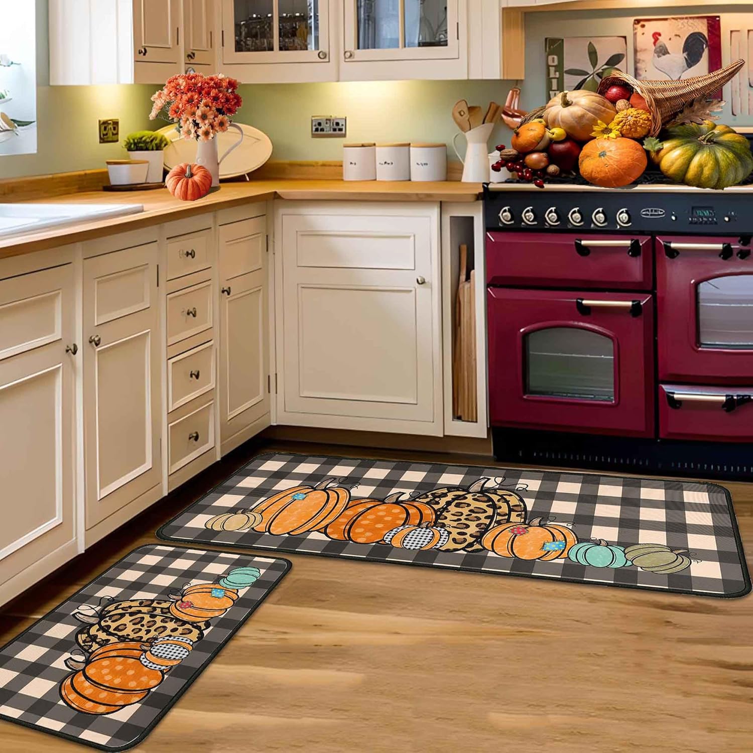 - Versatile Kitchen Mat Set: The fall kitchen rugs measure 17″x47″+17″x30″, L shape mat set perfect for the kitchen. They not only add a vibrant touch to your kitchen but also provide floor protection. These thanksgiving kitchen rugs are suitable for various spaces such as the kitchen, laundry room, living room, patio, porch, hallway, and entryway. Additionally, they make an ideal gift for Thanksgiving, and the Fall Autumn Harvest Seasonal Holiday.