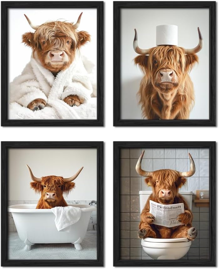 - 🐮【FUNNY BATHROOM WALL DECOR SIGNS】: Add humor and personality to your bathroom with these charming and rustic art prints. Perfect for highland cow lovers, these playful designs bring a whimsical touch to any space