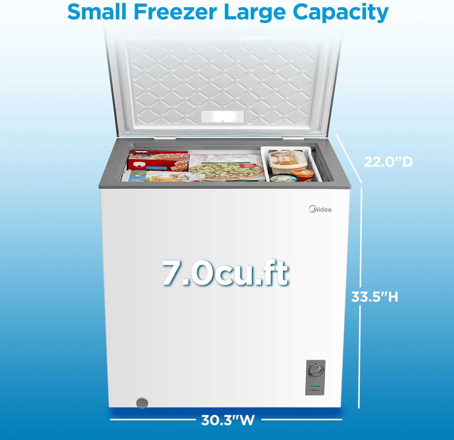 - Large Capacity- With a capacity of 7.0 cubic feet, this ice chest freezer provides ample space for all your frozen food storage, which can meet most of your needs. Product dimension 22″D x 30.3″W x 33.5″H