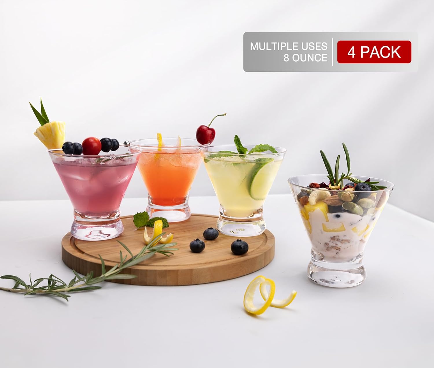 - Enjoy Your Favorite Drinks: 8-ounce stemless cocktail glasses are especially designed for classic martini, mixed cocktail, cosmopolitan, but great for juice, wine, other alcohol drinks, even creative appetizers and desserts. Enjoy your favorite drinks and life’s most leisure times.