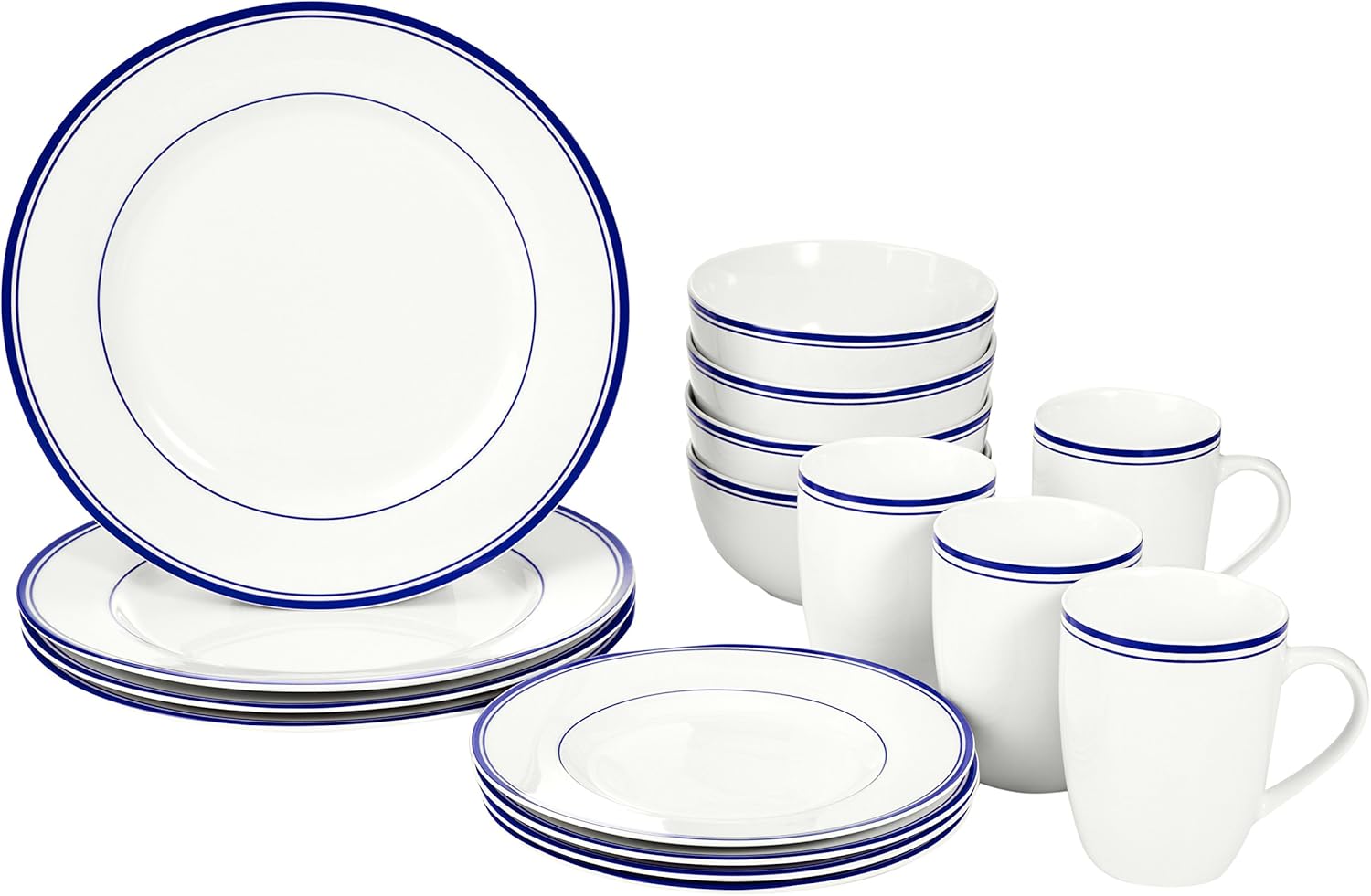 - Includes 4 each: 10.5-inch dinner plate, 7.5-inch salad/dessert plate, 5.5 x 2.75-inch bowl, and 4-inch-tall coffee/tea mug