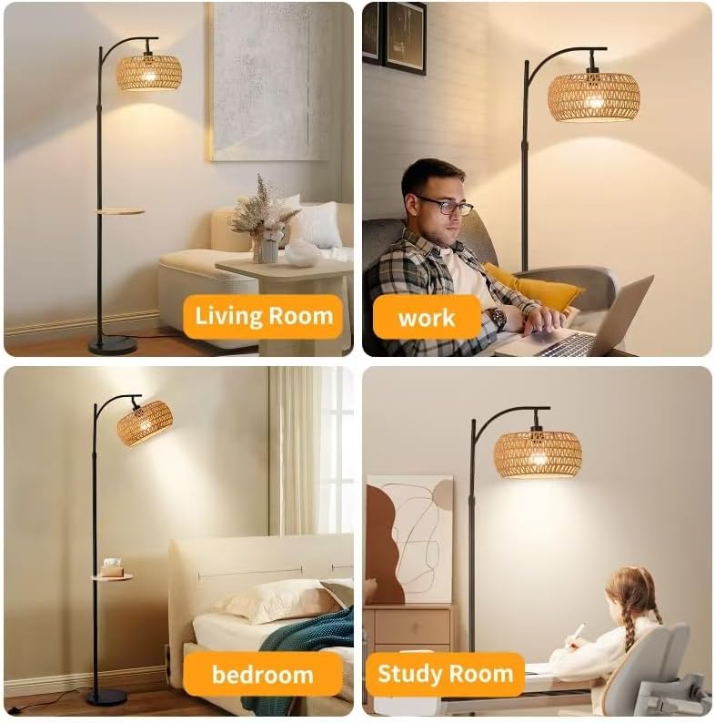 - Farmhouse Floor Lamps: Rattan floor lamp with table use the rattan lampshade, which creates beautiful pattern on the wall. Crafted with 100% natural hand-woven rattan, the Boho floor lamp features a design that seamlessly blends farmhouse charm and contemporary elegance. This versatile lighting piece effortlessly complements a wide range of decor styles, adding a touch of sophistication to any space.