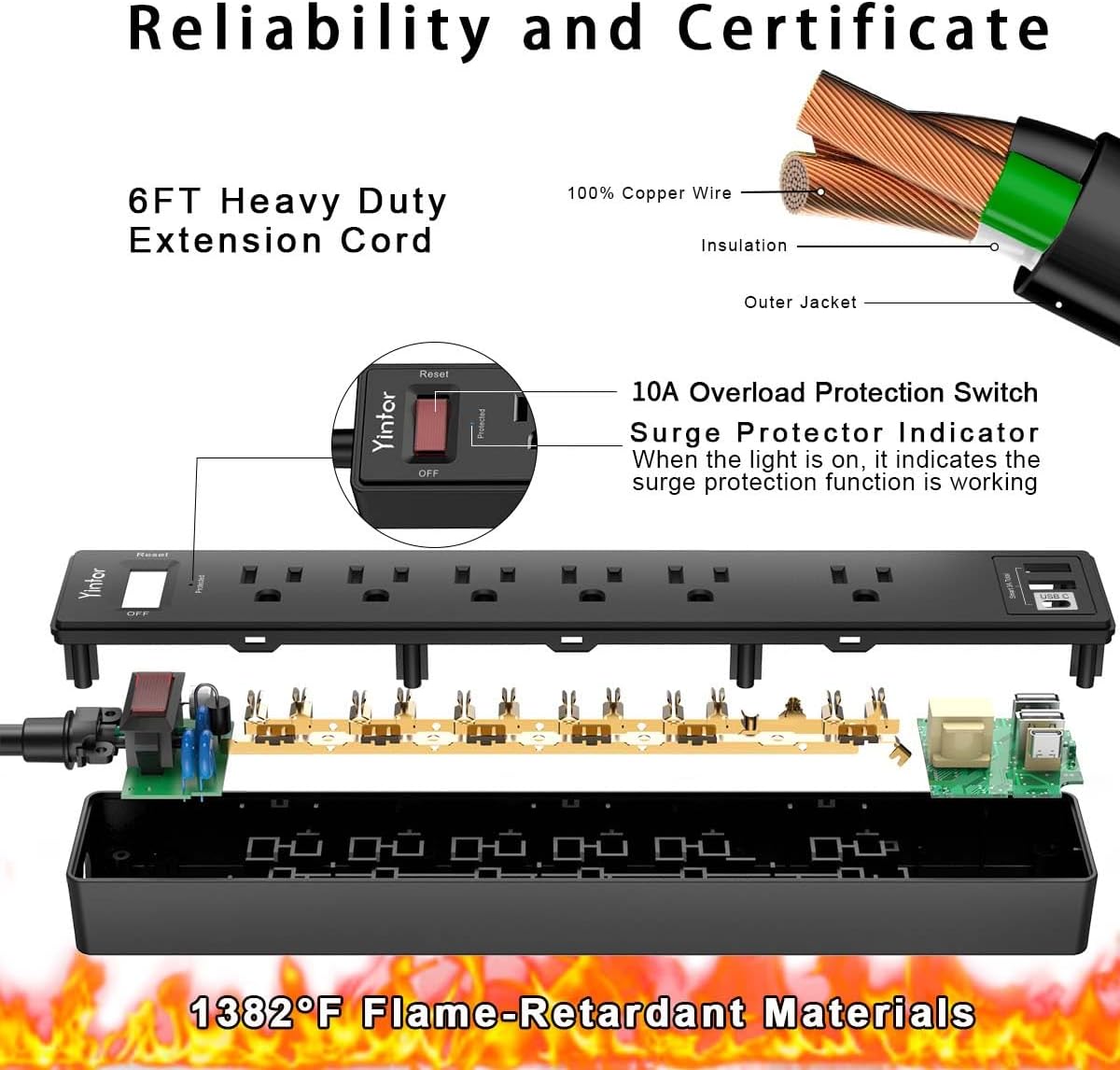 - Powercord with 6 Outlets & 3 USB Ports: 6 AC Surge protector outlets (1680 Joules) including 1 Widely Spaced Outlet, 2 USB A Ports & 1 USB C Port (5V/3.0A, 15W) , 6 feet powercord (1250W/10A), Surge protector indicator and 10A Overload Surge Protector switch protects against spikes and fluctuations.Wide range voltage design, can be used on 120v to 240v circuit.